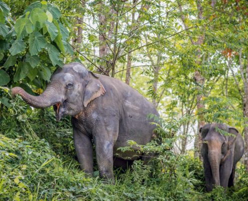 Sobald die Elefanten gefüttert sind, gehen wir mit ihnen in den Dschungel. Indem sie einen Sicherheitsabstand einhalten und sie von unseren Observation Salas aus beobachten, haben die Elefanten die Freiheit, ihr natürliches Verhalten, vom Baden und Spielen in unserem Teich bis hin zur Kommunikation miteinander, auszudrücken.